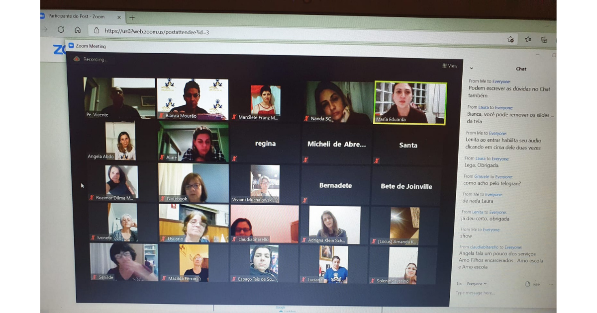 Na última sexta-feira, 13, a Coordenação do Serviço Nacional AMO Filhos Encarcerados, na pessoa da Coordenadora, Cláudia Bitarello estiveram reunidos com as Coordenadoras do Serviço Estadual AMO Filhos Encarcerados e as Coordenadoras Estaduais para definir os próximos passos desse serviço que começou a pouco tempo no Movimento, mas irá prestar o serviço de visitas e … Ler mais
